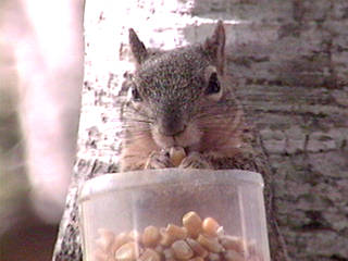 This is the original picture page devoted to photos of the squirrels in my Backyard. In the spring of 1999 I erected three squirrel houses in my backyard. One of the squirrel "condos" contained a spycam so you could look in on the squirrels! This all started in 1998 when I had squirrels nesting in my attic. I evicted them after an unfortunate little squirrel died in my stove's hood vent.